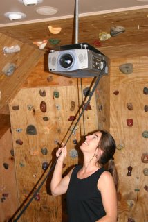 What started off as a quick proof-of-concept ended up being our projector stand for the last couple of months. We had two ladders set up like a scaffolding with boards in between them- and the Sanyo PLV-60HT sitting between them. What's worse is that we had to use the ladders for other tasks and had to break down and set up this system again. Mr. Stocks was kind enough to let us have his setup, and I did the attic crawl to make a mounting point up in the ceiling. Check out the Polk In-Ceiling speaker next to the fish eyes. What is in the background is the bouldering wall we built a while ago. For the home theater, the next step is to run cables (Jerry has given me some links to make my own if the ones I have aren't long enough). What I really want is a motorized mount. I want to do this just for the cool factor- as where it is now is high enough to be out of the way and really isn't in danger of interfering with the climbing gym. But to be able to push a button and have it lower.... aaaah.