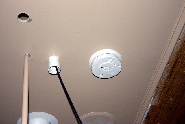 Ever notice how theaters (soon I hope to forget them) have those exit signs everywhere? I mean, they're important, but distracting. And I remember as a kid when people used to smoke in the theater. It was kind of crazy seeing the glow of a cigarette in a dark theater. Yeah, I'm rambling, but these thoughts knocking around in my head have lead me to installing a smoke detector (both AC and DC- but who the heck is going to hang out in the HT when the power is out) and an emergency light to be able to see if you happen to be there. And finally- I *can* smoke (cigars, duh) in my own HT. So there. (But, dang it, it'll probably set off the detector)