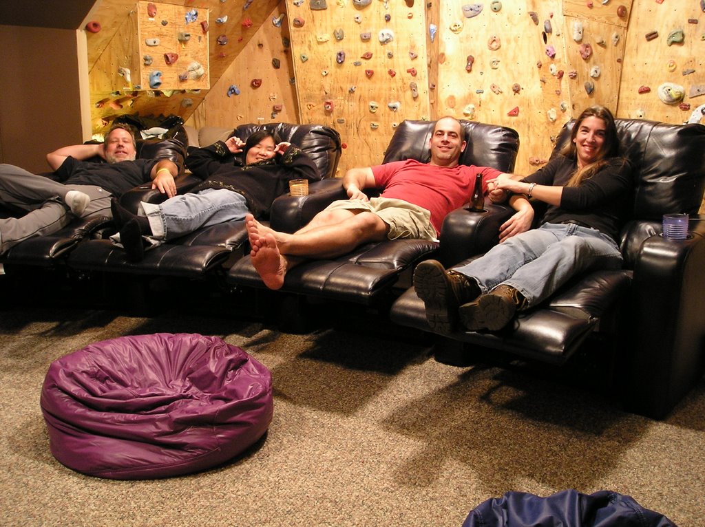 On a quest to get some ideas of the furniture we wanted, we lucked into finding a set of four motorized chairs that had been mis-ordered at a local showroom. It was supposed to be black, but instead is a Navy Blue. Works pretty darn well for us (little flecks of blue in carpet anyway).